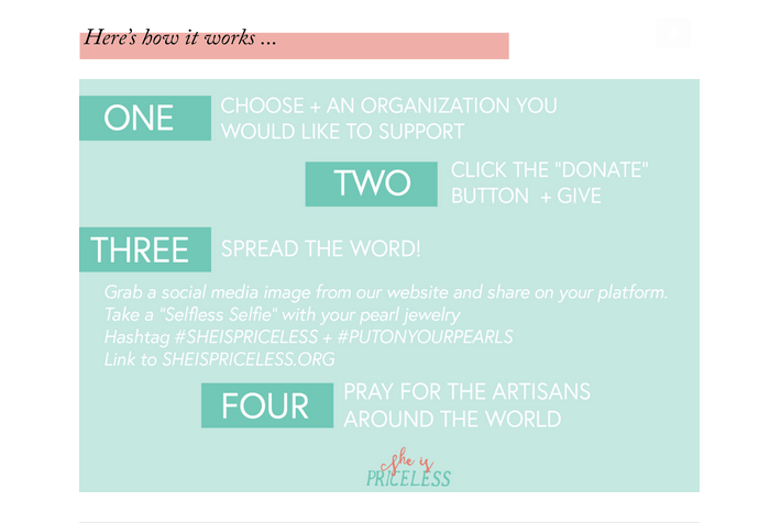 Search the hashtags #SheIsPriceless and #PutOnYourPearls to see and learn much, much more! And, thank you in advance for sharing this post; a simple Like and/or Share using the blue FaceBook buttons below is an easy way to do so. Bonus points and extra love for inviting your friends and family to support these opportunities, too.